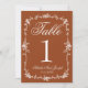 Classy and elegant botanical floral white and burnt orange wedding table numbers. As you see it features a rust old money background with white script that match the whole suite. And white outline floral frame.