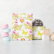 Everyday spring patterned wrap ideal for birthdays or other occasions. Wrapping paper in a bright fresh lime yellow green and white featuring pretty flowers butterflies and hearts in purple pink and spring green yellows . Uniquely designed pattern by Sarah Trett.