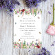 Feminine and pretty, this bridal shower invitation features an elegant design of watercolor pink and purple flowers including roses, tulips, lavender and eucalyptus greenery with bright coloured butterflies and bumble bees flying around.