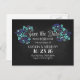 Rustic and modern chalkboard save the date postcards with blue floral bouquets, daisies, wildflowers and trendy calligraphy script font design.