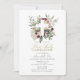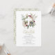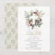 This elegant girl's first holy communion invitation features a white background with a white cross surrounded by white flowers, cherries, and greenery in watercolor. The reverse side features a light sage green background with floral patterns. Personalize it for your needs. You can find matching products at my store.
