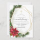 Trendy rustic christmas confirmation invitation with gold geometric frame and handwriting typography featuring sleigh bells, poinsettia flowers, holly, mistletoe and pine.