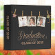 Enjoy a look back of selfies and photos with friends in this cute, elegant senior graduation memory keepsake. On a black background, three template photos hung by clothespins entangled with a pink and green flowers and pink ribbon. A single template photo in white frame with shadow on back with green ribbon and a pink flower. Text templates also provided.