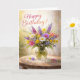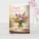 A bright and joyful birthday card design featuring a lively bouquet of colorful wildflowers arranged in a clear glass vase. Cheerful daisies, lupine, cosmos, and delicate filler blooms burst with pinks, yellows, purples, and whites, creating a fresh-from-the-meadow look. Set on a rustic wooden table with soft, sunlit bokeh in the background, the scene feels warm, natural, and uplifting.