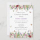 Summery, elegant and modern, this couples shower invitation features a lovely botanical garden of watercolor pink and purple flowers including roses, tulips, lavender and eucalyptus greenery with bright coloured butterflies and bumble bees flying around.