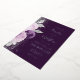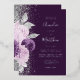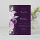 The left-hand edge of this elegant modern wedding invitation features a floral bouquet in shades of purple and lavender, trimmed with silver faux foil and faux glitter foliage and sprinkled with silver faux glitter. The customizable text combines real silver foil handwriting script, copperplate and italic fonts on a deep purple background. The reverse side features a matching floral design.
