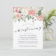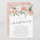 Baptême floral élégant et moderne ou invitation à la baptême présente un bouquet de roses pastel pastel doux, des pivoines et des hydrangées dans les tons rose roux, pêche et crème, avec feuilles botaniques verdoyants et eucalyptus. Personnalisez avec vos détails de baptême en lettrage bleu fumé élégant accentué par la calligraphie de style manuscrit. Inclut l'espace pour la cérémonie religieuse et une fête ou une réception à suivre.