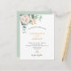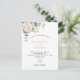 A chic white background. Decorated with a white floral, flower (peony)and green watercolored eucalyptus leaves, sprigs, greenery and a faux gold sprig. Personalize and add your names and wedding details. Black and golden letters.