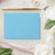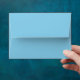 A custom envelope that features a sky blue printed background with colorful flowers printed on the inside flap.