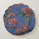 The abstract floral artwork on this round Pillow was created from an original photograph by ZoeSPEAK of a flowering tropical tree. The tree has thin black branches which form a linear pattern across the background. There are very few leaves on the tree, but there are plenty of tiny flowers in pompom clusters on all of the branches. The photo was taken looking up into the branches, with the sky as the background. In this version, the background is bright sky blue, and the flowers are shades of pink. The design has a canvas texture overall.