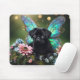 Mousepad with a sweet black pug puppy with fairy wings on a log with flowers