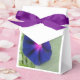 Tent-shaped favour box with purple ribbon and matching photo of delicate and vibrant twin pink-purple Morning Glory wildflowers.