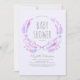 Rustic woodland and lavender purple watercolors baby shower invitation with flowers, feathers, and deer antlers.