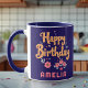 Floral Flowers Happy Birthday Handlettering Coffee Mug. Celebrate a special birthday with this charming personalized mug! Featuring a hand-drawn floral design, cheerful "Happy Birthday" text in playful orange script, and a custom name. Ideal for daughters, nieces, granddaughters, or friends.