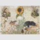 Vintage colourful forest floor botanical illustration collage with wildflowers, sunflower, and mushrooms that were painted in watercolors. A sweet bunny rabbit and sleeping fox, bird with a nest and a chipmunk are hiding among the foliage and flowers. Placed over an ephemera collage with script handwriting lettering advertisements and ledger pages form the background. This warm and welcoming collage was graphically designed by internationally licensed artist and designer, Audrey Jeanne Roberts, copyright.