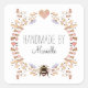 Earthy delicate stylized floral frame product product label stickers featuring "handmade by", with the maker's name within a pretty earthy stylized floral with pink heart and bee.