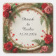 A decorative circular floral frame adorned with vibrant red and pink roses, green leaves, and tiny hearts. Represents romance and elegance, suitable for festive occasions or romantic invitations.