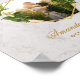 This elegant floral wedding design has a replaceable photo of lovers kissing in an irregular gold frame with calla lilies and fern left and right, over two gold hexagons that overlay. Above the frame, there is the message "Welcome to the wedding of", with the word Welcome written in an elegant script, the rest in caps. Under the frame, the names are written in the same elegant calligraphic script, the date in caps. All text is golden. The background is white marble.