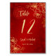 This Chinese wedding table number cards features beautiful gold line art flowers and a red double happiness symbol on a shimmering ruby red background.