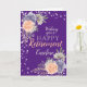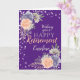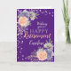 An elegant retirement congratulations card comprising of a purple background decorated with a pretty floral watercolor pale pink and pale purple peony roses, foliage and strings of lights. The perfect way to say congrats to someone in style on their retirement. Personalize with a name and message which currently reads "All the best for this new chapter in your life!" Perfect for an office coworker, family and friends .