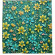 A vibrant pattern of stylized yellow and blue flowers is set against a rich teal background. Various shades of green leaves complement the colourful blooms creating a harmonious and decorative design.