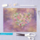 Romantic heart shape floral arrangement with gold, antique handwriting overlay over an abstract, pink, lavender purple, and gold paint wash.