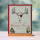Cet élégant panneau de Noël Joyeux présente des illustrations à thème de Noël Occidental dessinées à la main à l'encre noire, montrant un crâne de cerf / tête de renne orné de roses et de cactus contre un élégant arrière - plan gris. Le texte est modifiable. Personnalisez avec votre nom de famille.