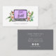 Beautiful design for virtual assistants features a watercolor laptop computer illustration flanked by bouquets of blush pink peony flowers. Customize the front with two lines of text in handwritten script and classic serif lettering, with your name or business name appearing on the laptop screen. Add your VA contact information to the reverse side.