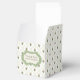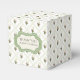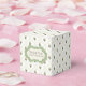Pretty green, ivory and white wedding favour gift box with a lattice pattern, with colourful flowers. A green and ivory decorative plaque, on the front of the box, has custom dark brown text ready to personalize to read what you want.