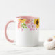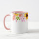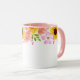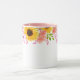This two tone floral mug has pretty summer flowers of pink wild roses, coral poppies and cheery sunflowers around the top edge of the mug. Sample handle and interior shown is pink.