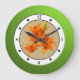 A botanical and homey style, where photo of a group of orange Lily flowers meets the white clock face circle with black dots for all hours but 3, 6, 9 and 12. There is added what appears like a lime green coloured frame.