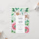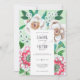 Caroline Bonne Muller ©2019 Hand painted wedding invitation with green leaves and white and pink flowers on a green background and little fuchsia accent colours.