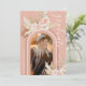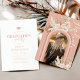 Rustic bohemian graduation party invitations featuring a girly pink background with a rainbow arch feature, a photo of the graduate, watercolor desert dried palm leaves, pampas grass, pink & white florals, and a elegant text template that is easy to personalize.