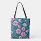 A beautiful floral pattern against a peacock blue background on a reusable tote bag.