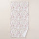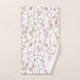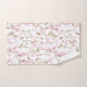 Floral-patterned towels hang neatly, showcasing pink blossoms and green vines. The elegant design conveys a fresh, natural, and calming tone.