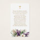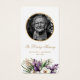 Elegant purple and white floral photo funeral/memorial/prayer cards featuring a gold photo frame with purple flowers, white orchids and greenery on the front and a gold cross with a floral arrangement at the back.