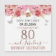 Girly glitter, millennial pink background, with fancy script name typography. Happy 80 and fabulous birthday design template. Pink Roses and butterfly top border. Great for 80th celebrations. Save the date celebration reminder.