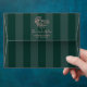 Wedding theme featuring text inside hand drawn pink frame on front with pink floral botanical line drawing over emerald green stripe background. Return address on back flap.