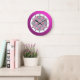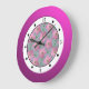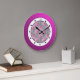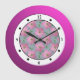 A botanical and homey style, where photo of a pattern of sweet pink Geranium flowers meets the white clock face circle with black dots for all hours but 3, 6, 9 and 12. There is added what appears like a pink coloured frame.