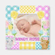 This sweet baby announcement design features a peaceful newborn photo framed by a soft pastel floral‑plaid collage. The patchwork border blends gingham, polka dots, and delicate pattern blocks in pink, blue, yellow, and purple, accented with charming illustrated flowers and adorable character motifs. The mix of textures creates a gentle, handcrafted feel with a warm, whimsical mood. Perfect for birth announcements, nursery décor, or keepsake gifts, this design pairs soft colour, playful details, and heartfelt charm.