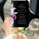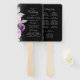 The left-hand edge of this elegant modern wedding program fan features a floral bouquet in shades of purple and lavender, trimmed with silver faux foil and faux glitter foliage and sprinkled with silver faux glitter. The customizable text combines pale silver grey handwriting script, copperplate and italic fonts on a black background.