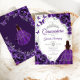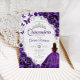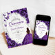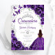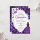 Purple silver and white floral Quinceanera celebration invitation. Features brunette girl in ball gown dress, script font, silver butterflies, watercolor roses and tiara. Perfect for an elegant princess style glam celebration. Personalize with your own details. Printed Zazzle invitations or instant download digital printable template.