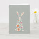 Designed with an upright rabbit centered on a cool gray background, this illustration feels like a decorative emblem meant to be admired up close 🐰. The rabbit’s long ears lift neatly above its head, framing bright blue eyes and a small peach-toned nose that gives it a gentle, friendly look. Its entire silhouette is filled with a dense garden of flowers and leaves, where warm oranges mingle with soft pinks and deeper crimson blooms. Green foliage and curling stems weave everything together, creating the look of two floral paths meeting and intertwining like a quiet sign of affection. A soft drop shadow behind the rabbit adds depth, as if the figure is slightly raised from the page. Any greeting text can sit above the rabbit in a simple dark gray, with a smaller line below in muted green, leaving the artwork as the main focus 🌷. The petals show fine linework and shading, and the leafy stems curl around the belly and legs in looping, lace-like patterns.