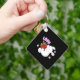 With a design featuring a cartoon-style white rabbit hugging a red heart with the word “LOVE” on it. Surrounding the rabbit are small white flowers. The background of the keychain is black, and it has a silver-coloured ring and chain attached to the top.