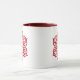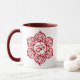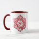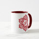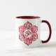 An Aum or Om design sits inside of a stylised lotus flower. The circular pattern is coloured with a deep red that is highlighted to create a light shine on the surface. Six elegant leaves reach out from the center of the design to create a symmetrical pattern on this fashionable mug. This stylish design is a striking representation of this spiritual symbol.