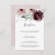 Cette carte d'encarts de réception de mariage romantique à fleurs est parfaite pour un mariage élégant. Le design boho rustique moderne présente des fleurs d'aquarelle romantiques dans des tons doux de bordeaux, mauve, rose rousse et blanc crème avec des feuilles verts. Personnalisez cette carte détaillée de boîtier avec vos informations de réception et incluez également votre adresse de site mariage !