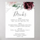 This floral romance wedding drinks menu sign is perfect for an elegant wedding. The modern rustic boho design features romantic watercolor flowers in soft tones of burgundy, mauve, blush pink and cream white with green leaves.