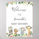 Pretty and delicate pink coloured floral baby shower welcome sign featuring some floral arrangements and greenery. Ideal for a girl's safari or wild one themed girl's baby shower.