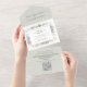 This design features modern dusty rose floral sage, with botanical greenery and a QR code reply, with flowers rsvp leaves babies breath, guest response via website online, a scannable QR code scan email, an elegant seal and send trifold, stylish trendy calligraphy script font, an ampersand typography style overlay text, with beautiful soft romantic garden design
