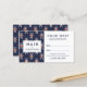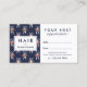 A floral appointment card for a hair stylist in navy blue and white with a pattern of white scissors decorated with hand-drawn flower bouquets in orange, pink, and red.